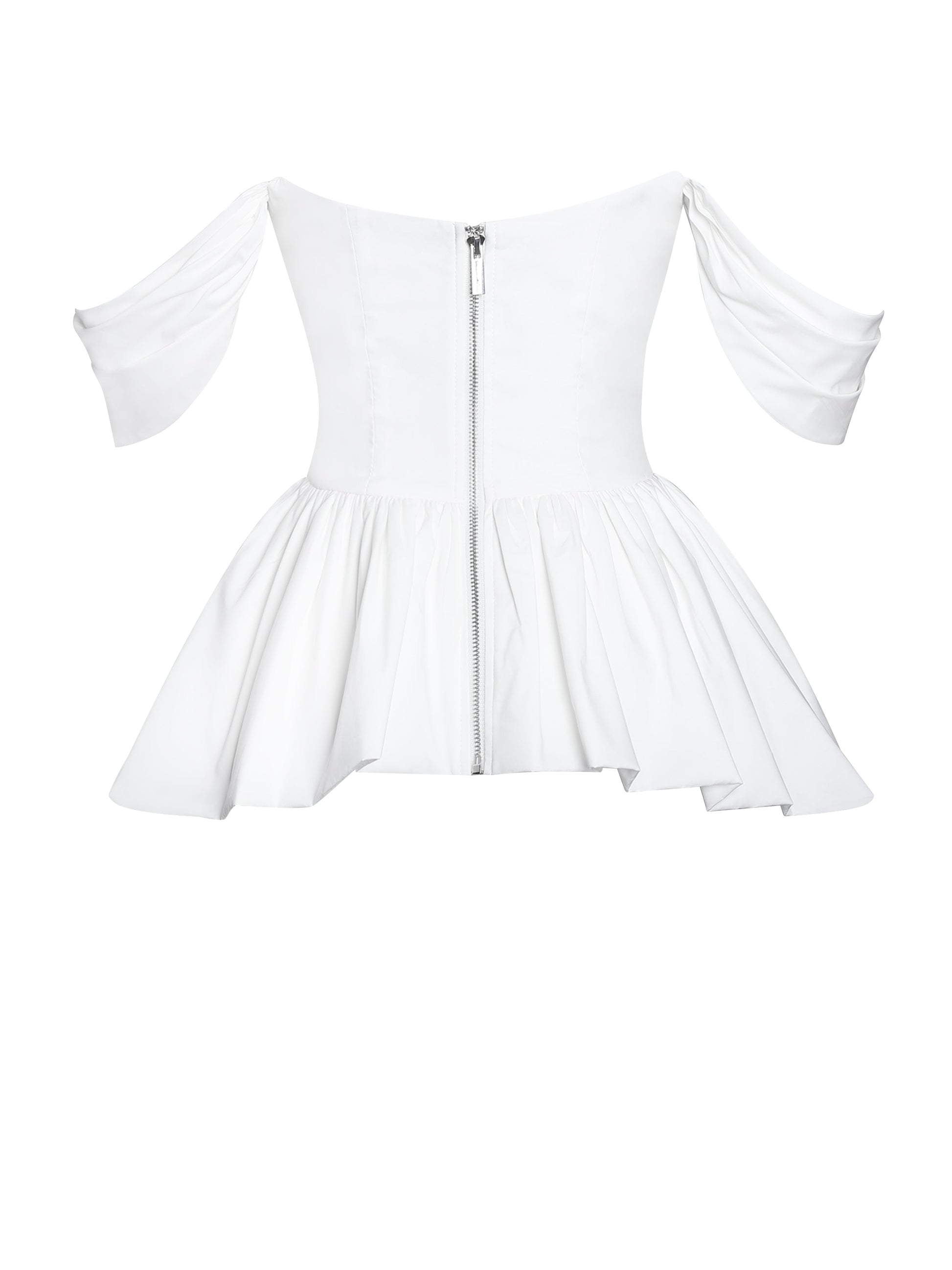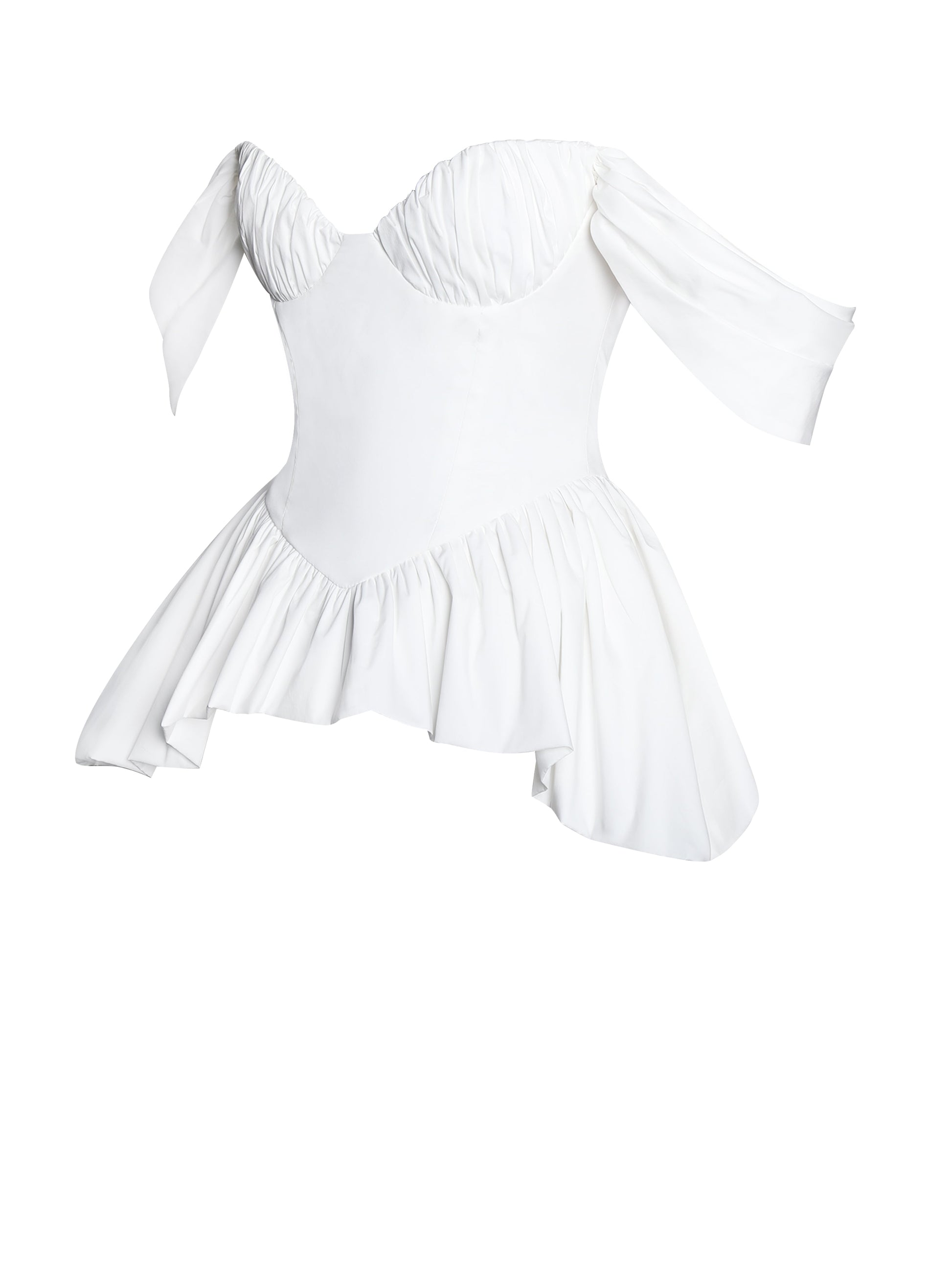 The Qistina Top is a chic business casual piece, perfect for the office and spring outings. Crafted from crisp white cotton poplin, it features an off-shoulder neckline that adds a touch of elegance. The ruched breast design with padded cups provides structure and a flattering fit, while the peplum silhouette and bubble hem create a graceful, feminine shape. Versatile and stylish, this top is an effortlessly sophisticated addition to any wardrobe.